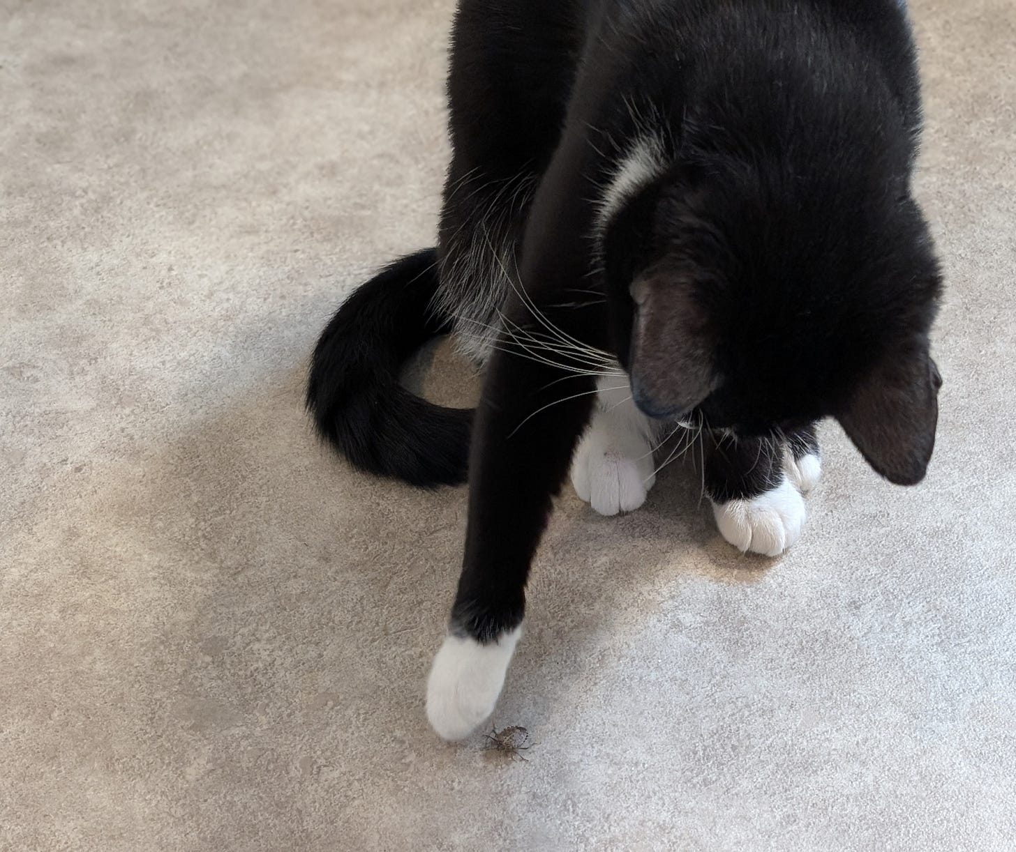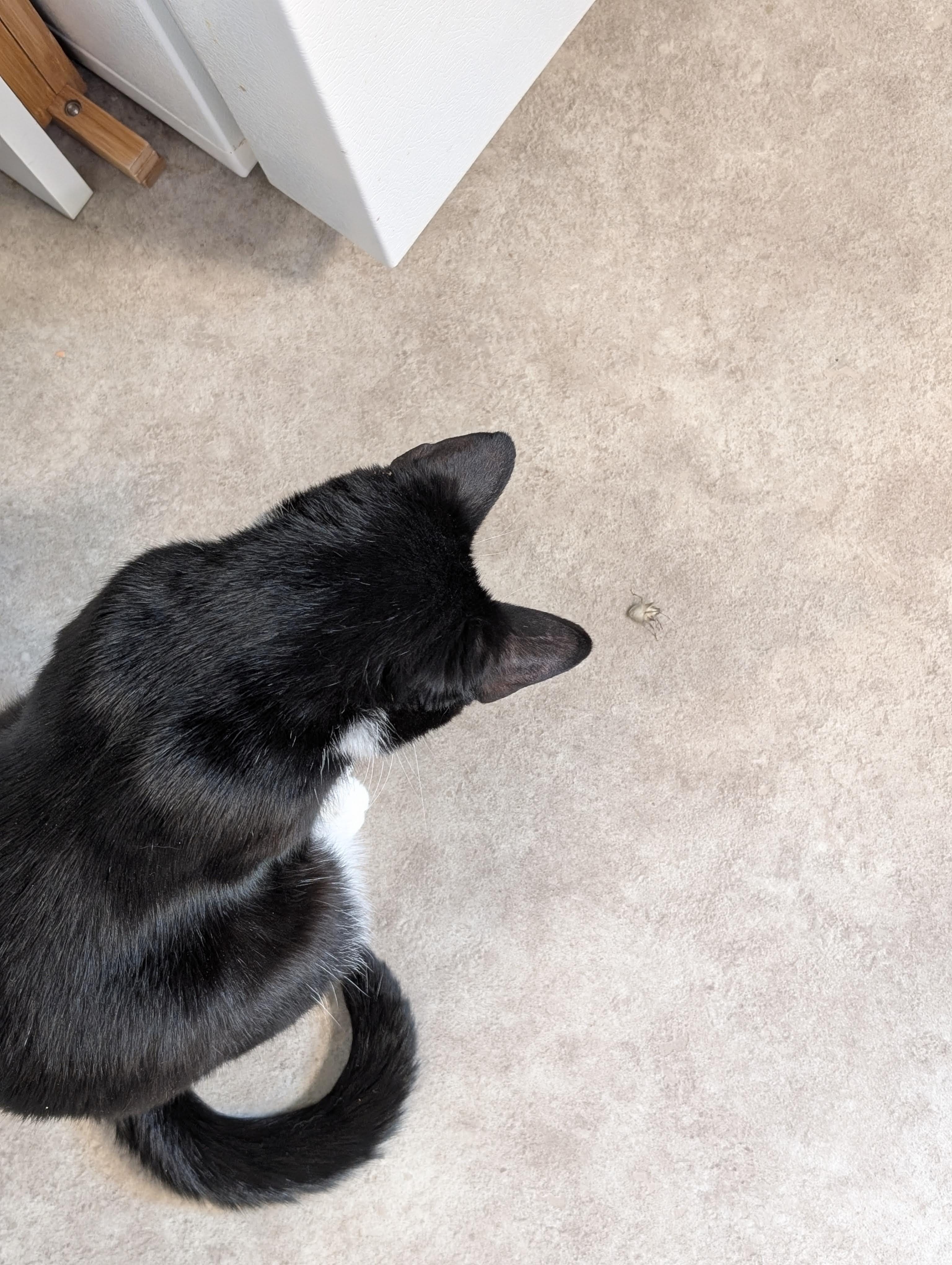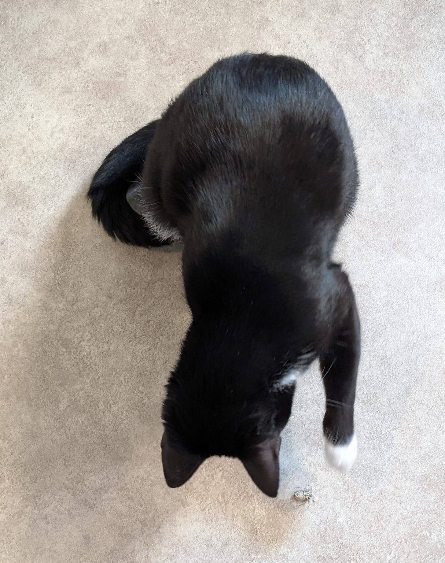 My panther cat stalks spiders and any other crawly things. . . When a bug is involved, she can hold her "post" for a very long time--that is at least one thing she's patient about. I find corpses and know she's been working through the night. :)