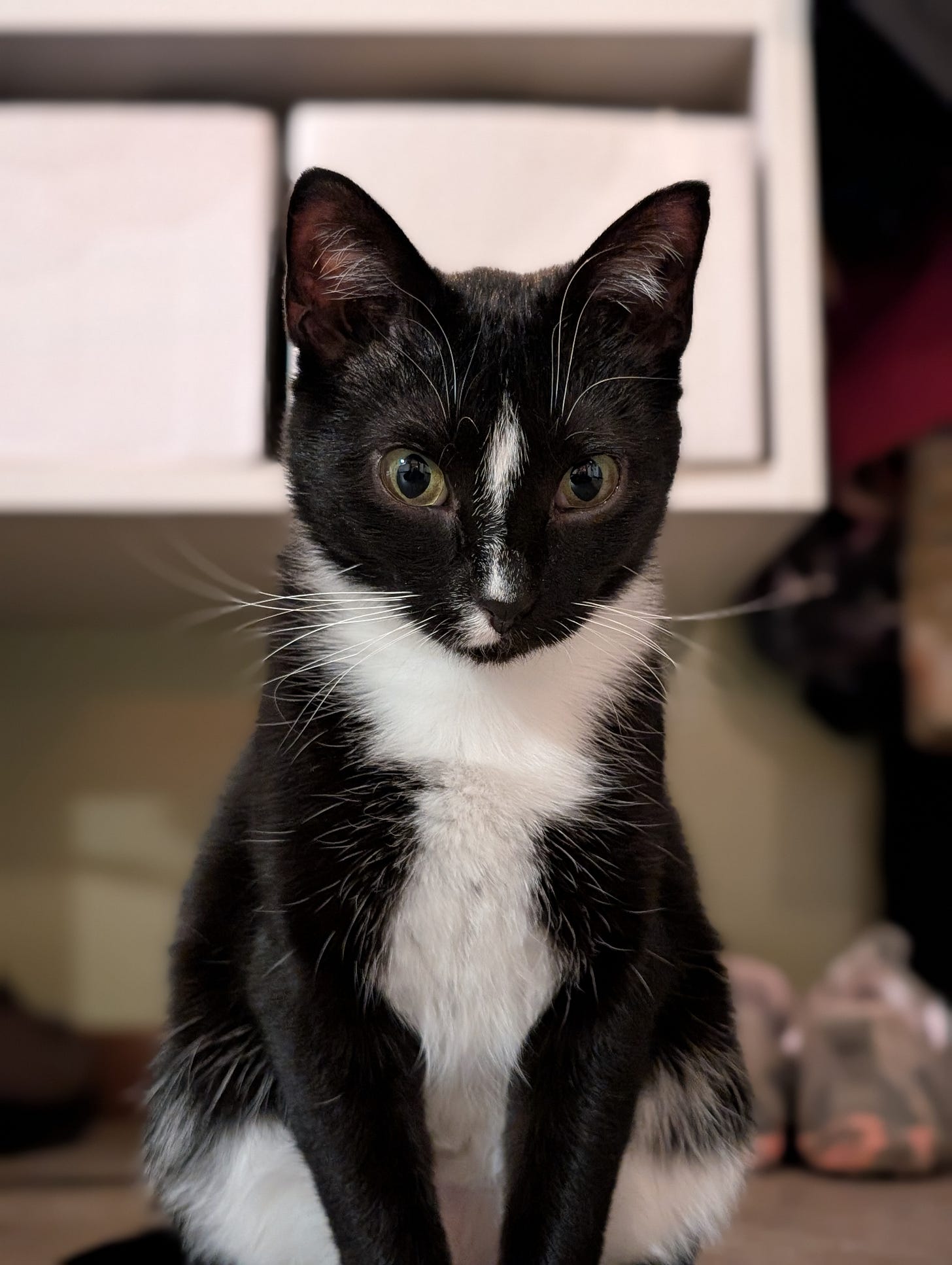 Whitsun greeted me at the door this morning. The last couple times, she is right at the door waiting for me to open it. She must run very, very, fast to get to the door before I open it. Does she hear me drive in? Maybe she is just that fast and she heads to the door when she hears the first beep of the digital lock. She got lots of petting this morning and I did a bit of playing with her as well. She is one very cute and friendly kitty.