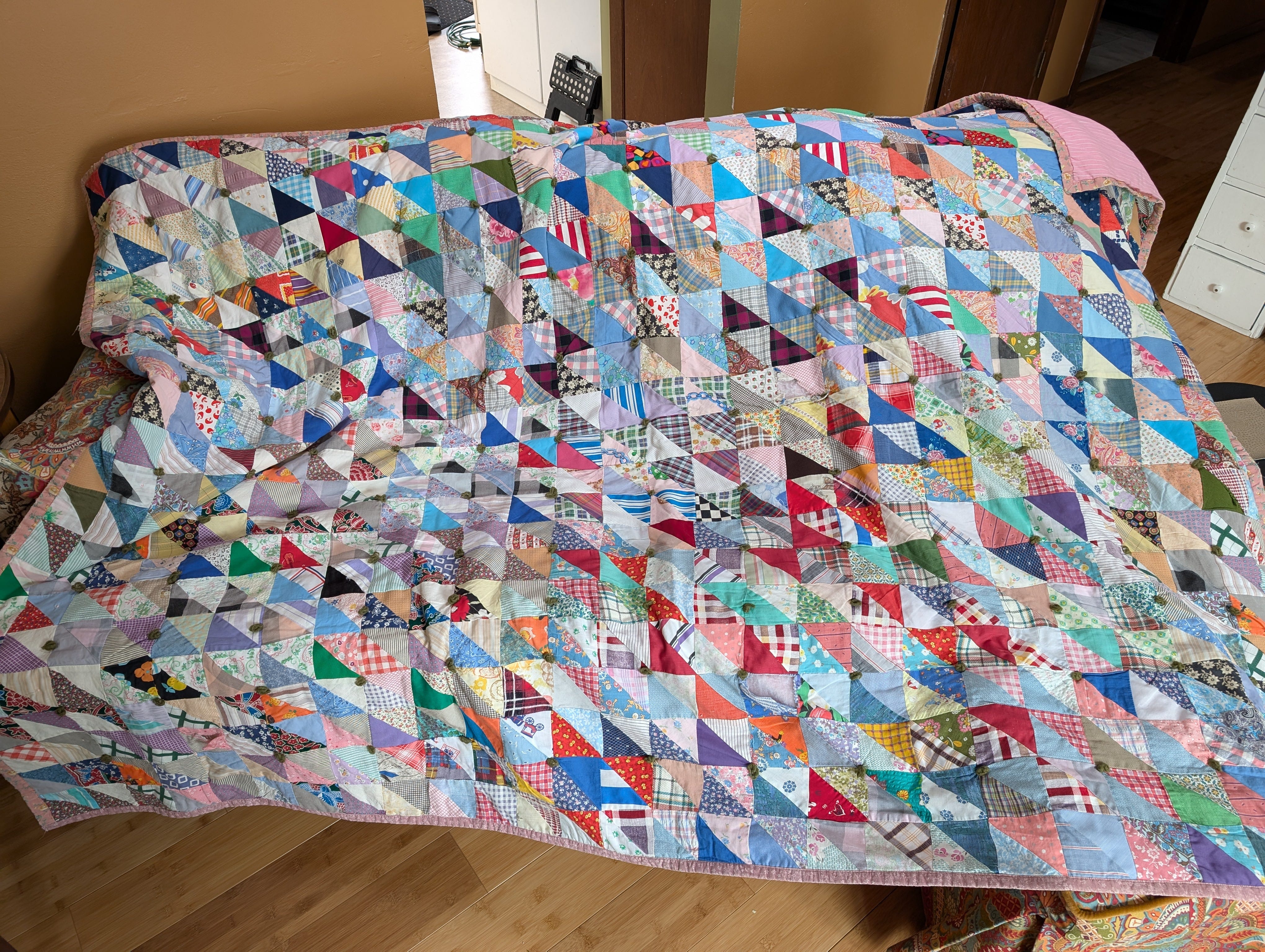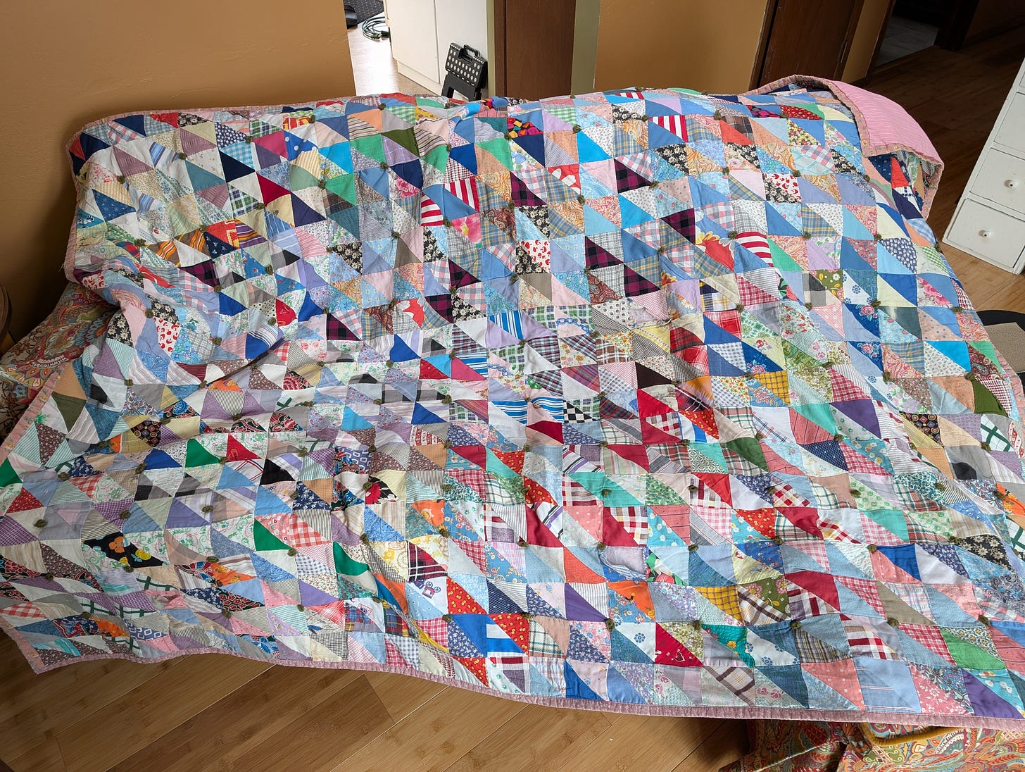 Her mother, my great-grandma, who I was privileged to know in my childhood, was a rabid quilter, turning out piles of tied scrap quilts from a sewing room the size of a walk-in closet. We got one of her quilts as a wedding present. She loved doing curved piecing. My great-grandpa (her husband) had a basement full of found, salvaged, and repurposed stuff. I have some of the furniture he made from pieces salvaged from his job at a local furniture factory. My changing table as a baby was one of these. A few years ago, the Formica surfaces peeled off as the glue aged (I turned 51 recently; that glue is old), and I discovered that Grandpa S. had made my changing table with discarded solid mahogany drawers from R-way Furniture, where he’d worked for many years. The three drawers are slightly different sizes; were they samples or factory seconds? I’m not sure. Solid mahogany!