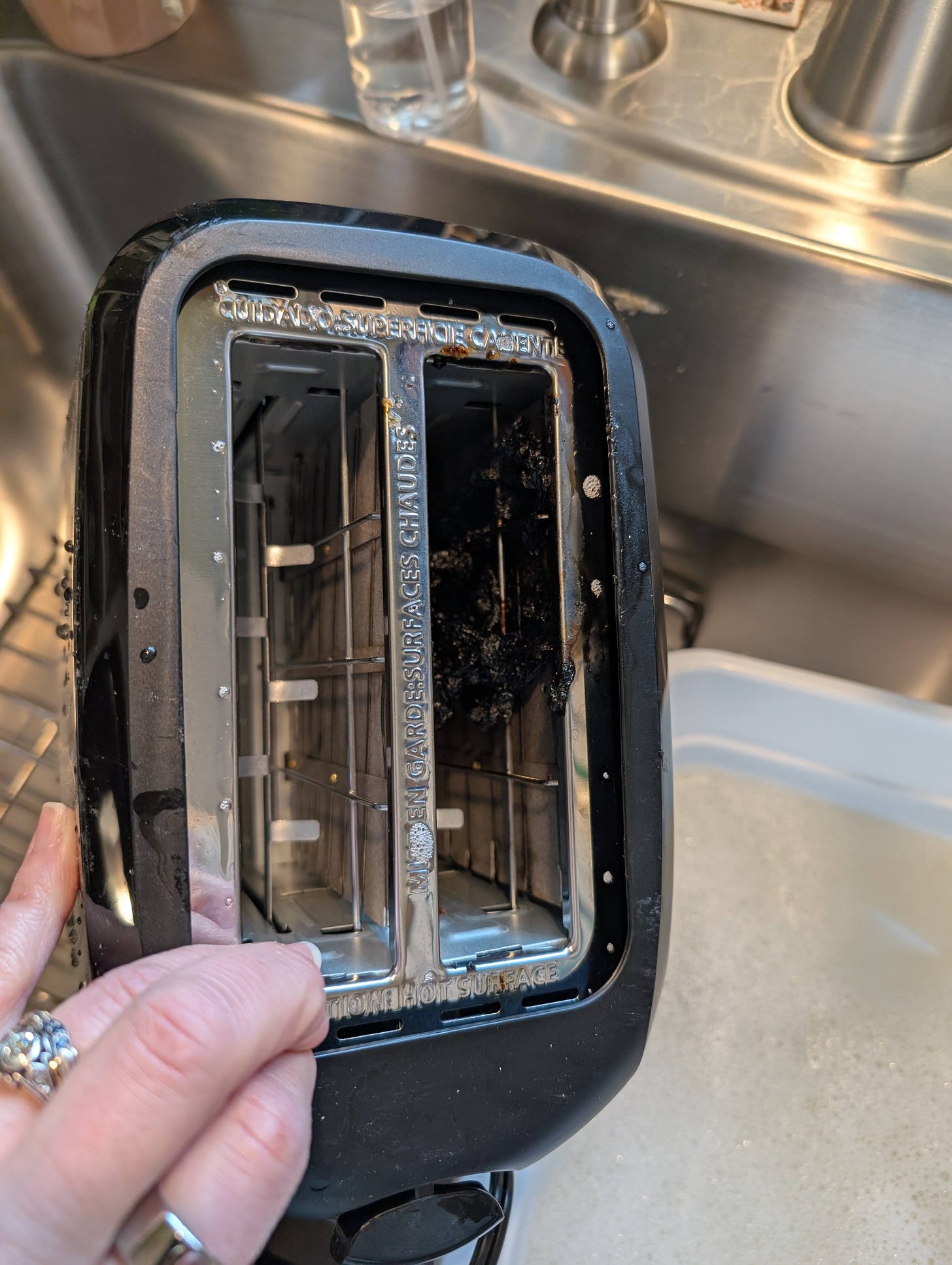 Thankfully, I was standing right beside it, and it took me only a second to mentally process the actual, live, for-real flames leaping from the top of my toaster. “Heat, Air, Fuel” echoed in some limbic part of my brain, and I quickly ripped the cord out of the wall and shoved the toaster to the floor and away from my particle board and melamine kitchen cabinets.
