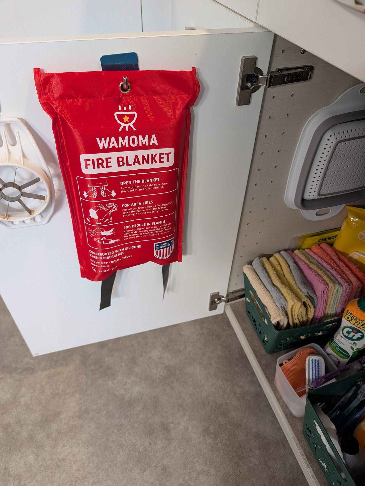 I swung open the doors below the sink and yanked the fire blanket free.