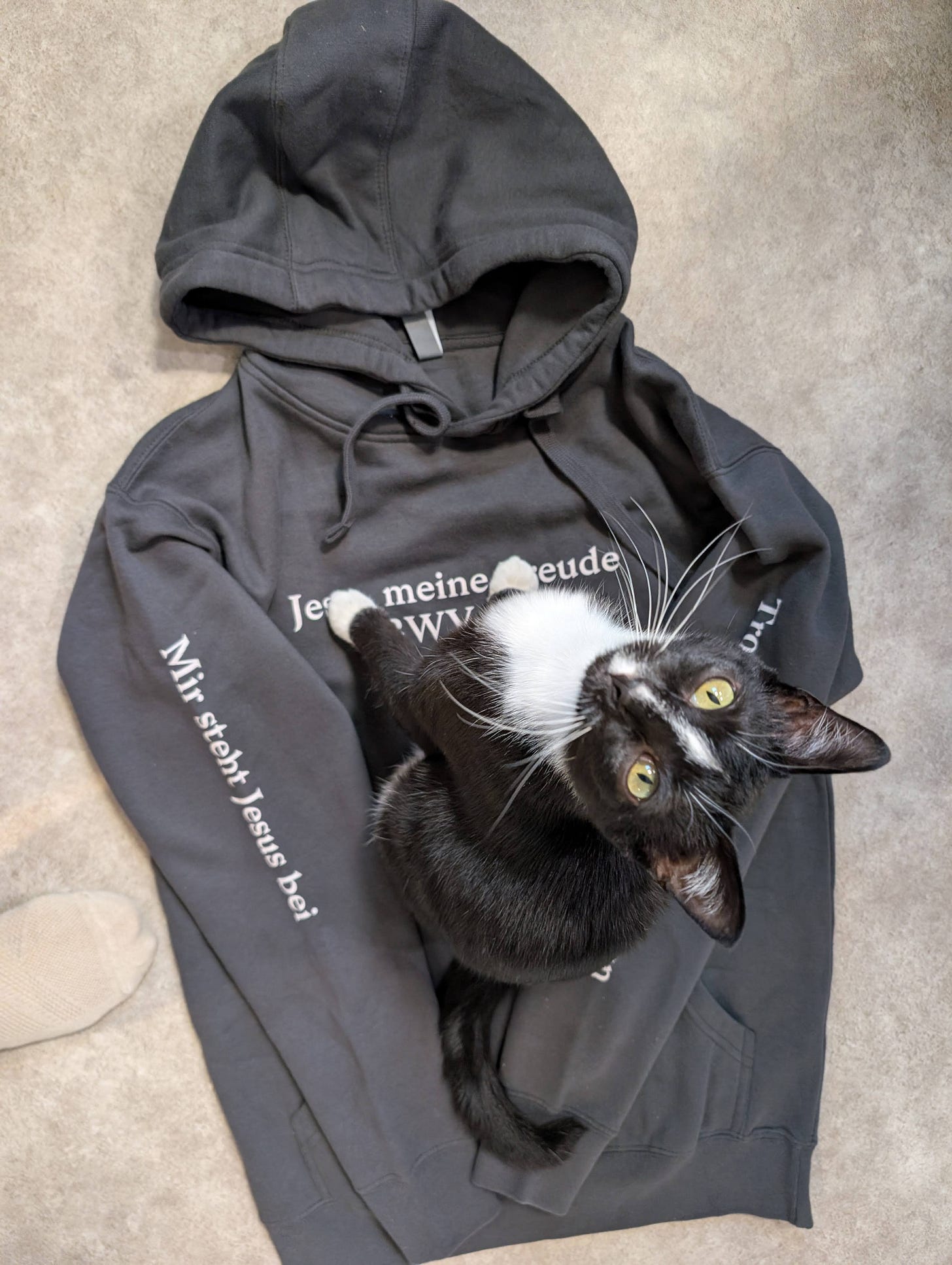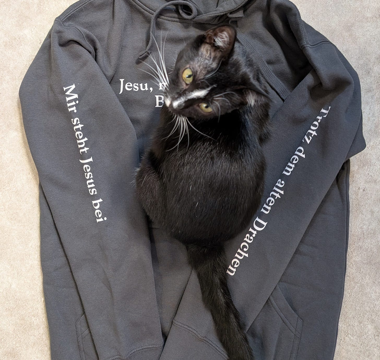 The second hoodie has two lines from my favorite Bach motet. “Trotz dem alten Drachen” (Defy the ancient dragon, i.e. Satan) and “Mir steht Jesus bei." (Jesus stands by me.)