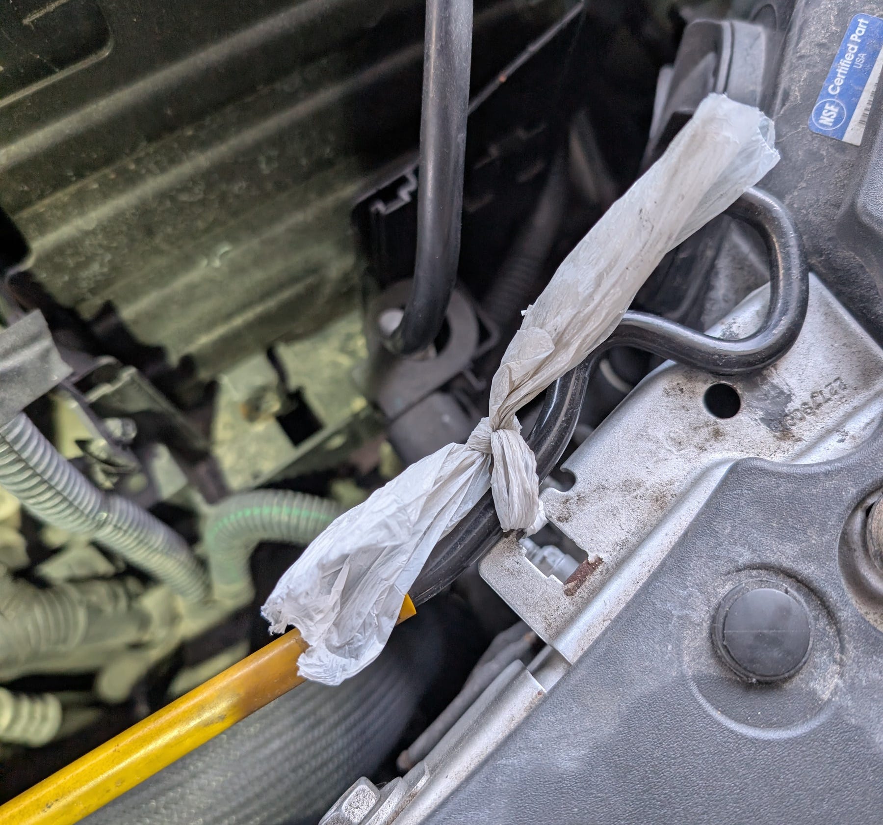 When I spotted the previous owner’s hack to keep the hood prop in place because the plastic retaining clip is missing, I had a hearty third-owner-syndrome chuckle: