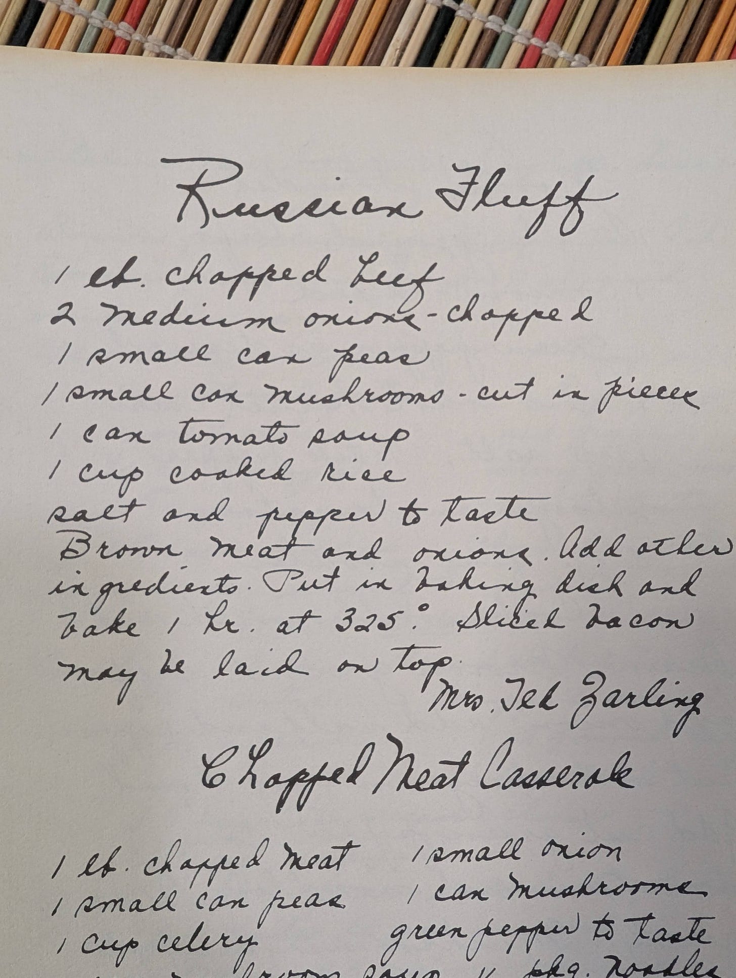 I’m not sure what is Russian about that dish. I can’t tell what’s “fluff” about it, either. Most of the casseroles are very similar: a lot of white carbohydrate (rice, noodles, or potatoes), a bit of cream soup, not too much onion, and perish the thought of using an entire green pepper, even in a dish meant to serve 8-10 people, as in the photo below. There are no spices other than black pepper and salt, and nearly every vegetable involved comes from a can.
